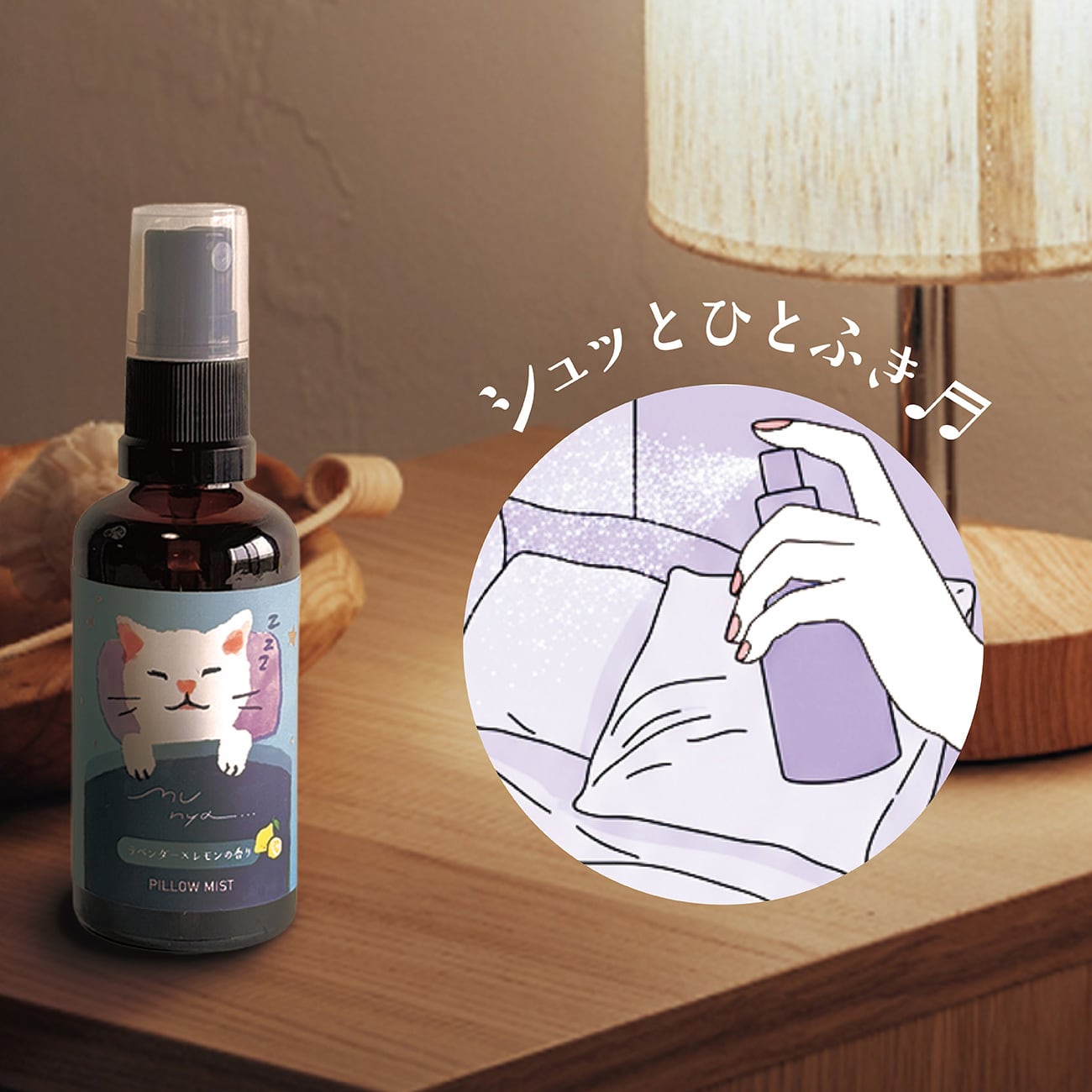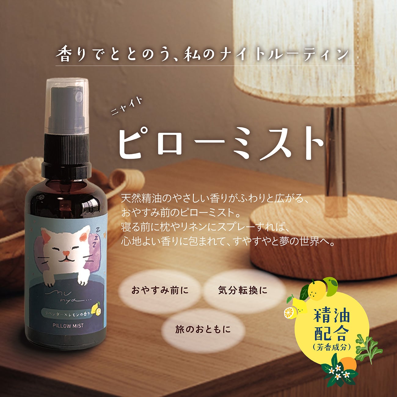 天然精油のやさしい香りがふわりと広がる、おやすみ前のピローミスト。
