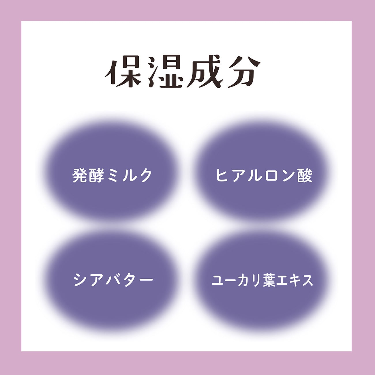 塩化Na、酸化チタン、ポリアクリル酸Na、乳酸桿菌/乳発酵液(牛乳)、シア脂、ヒアルロン酸Na、ユーカリ葉エキス、ポリアクリル酸、ベントナイト、ステアリン酸PEG-75、トコフェロール、水、BG、PG、シリカ、香料、青1、赤106