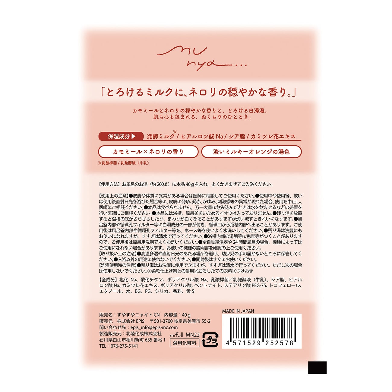 munya すやすやニャイトMILKバスソルト カモミール×ネロリ|にごり湯 入浴剤 保湿 プチギフト