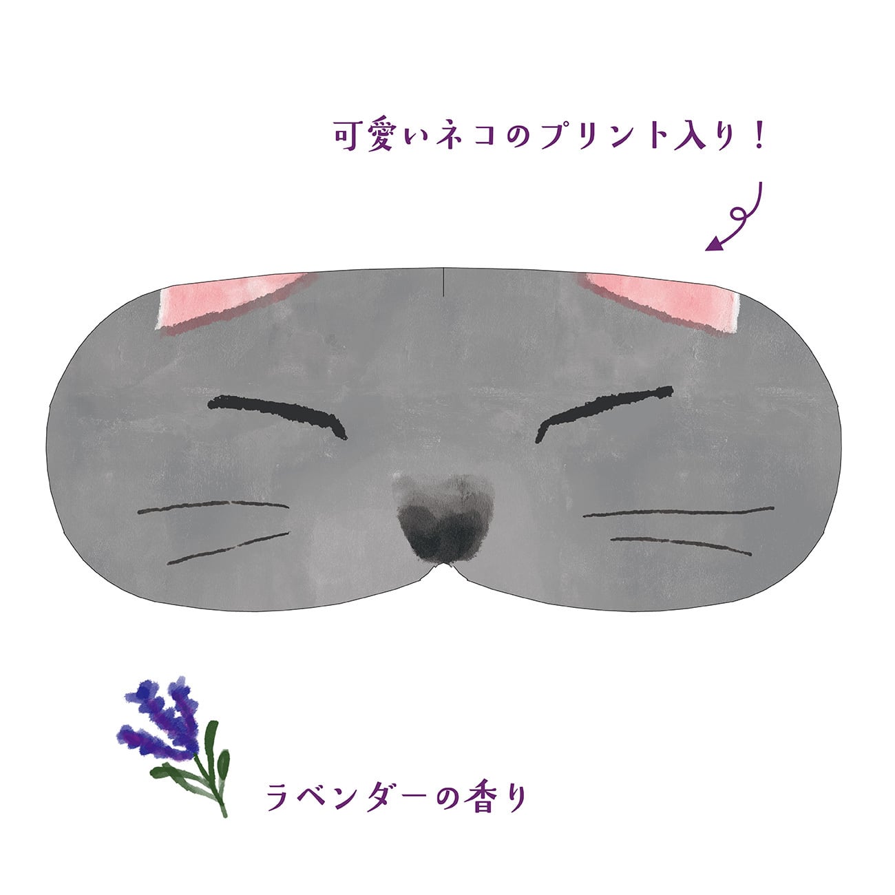 ねこの眠っている顔になりきれる、ラベンダーの香りのイラスト付きホットアイマスク。