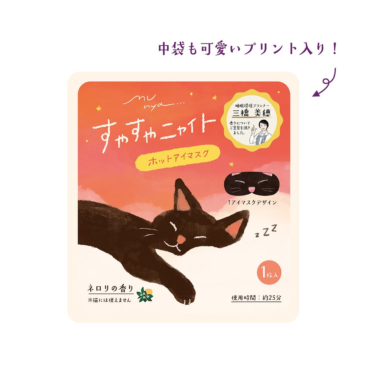 ねこの眠っている顔になりきれる、ネロリの香りのイラスト付きホットアイマスク。
